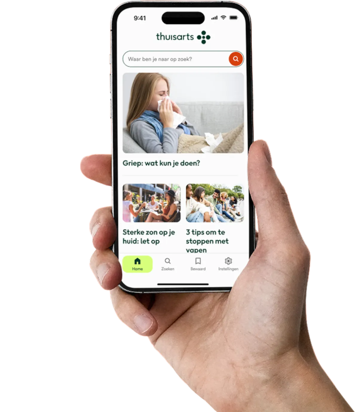 Met de app heb je Thuisarts steeds bij de hand. Zo vind je snel een betrouwbaar antwoord op al je vragen over gezondheid en ziekte.