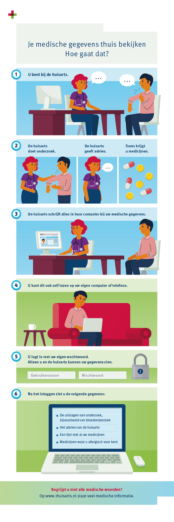 - Plaatjes die uitleggen hoe het gaat als je je medische gegevens thuis wilt bekijken: Plaatjes: je medische gegevens thuis bekijken.