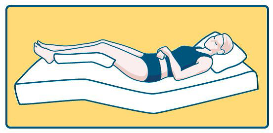 Zo ligt iemand goed op de rug: het hoofd niet te hoog en een kussen onder de onderbenen.