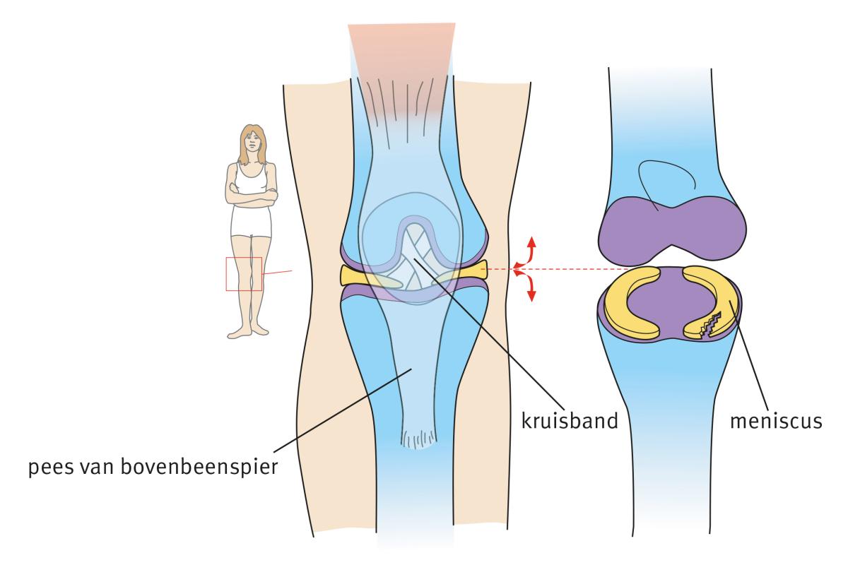 In elke knie heb je 2 schijfjes kraakbeen tussen je bovenbeen en je onderbeen. De ene is de binnen-meniscus, de andere de buiten-meniscus. De schijfjes zijn belangrijk om je knie soepel te kunnen bewegen. Ze vangen ook schokken op.