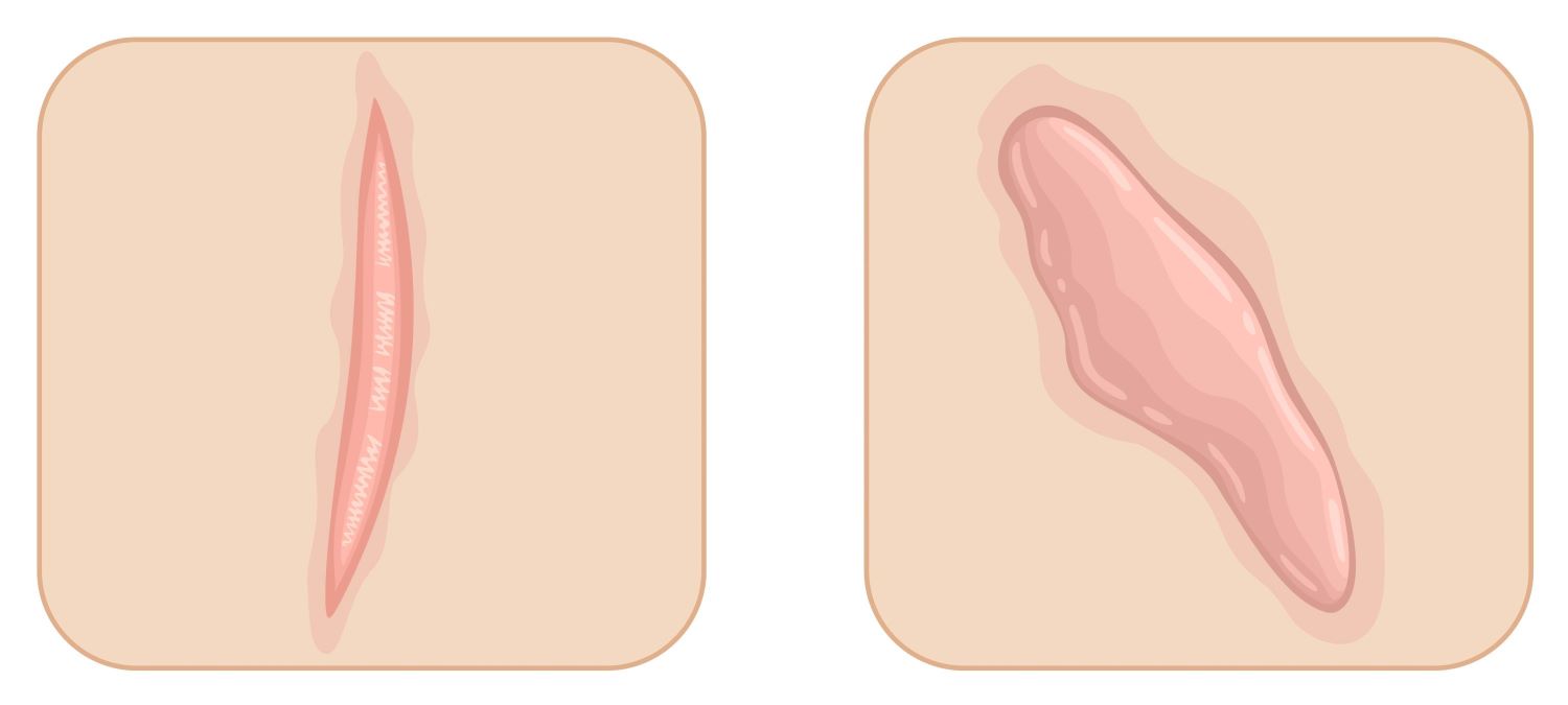 Rechts: een dik litteken dat groter wordt dan de wond die je had